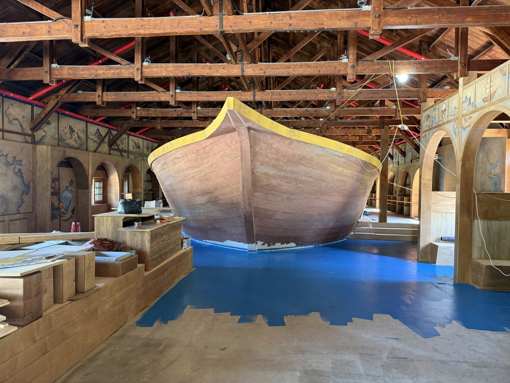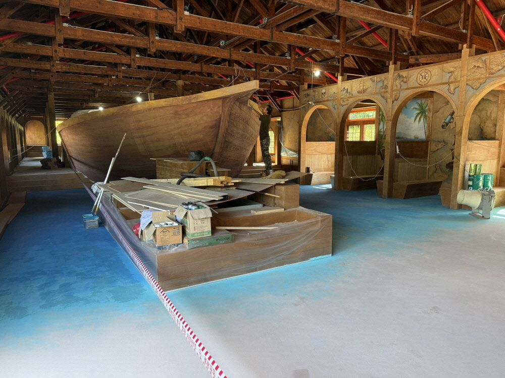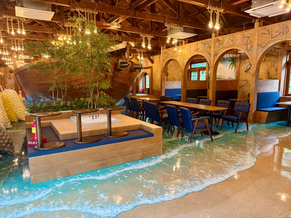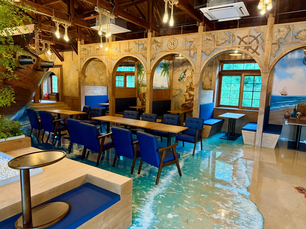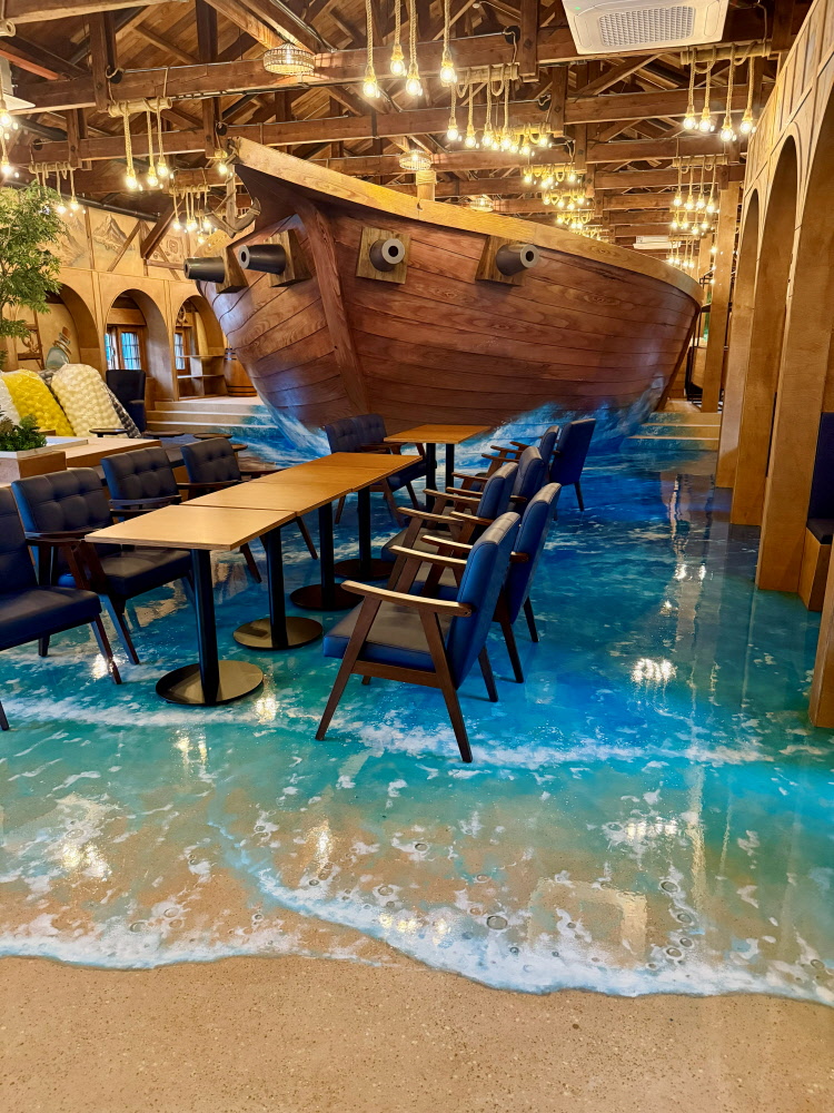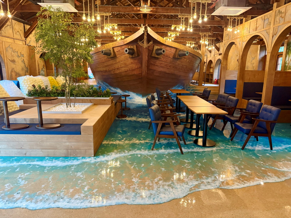 보물섬을 찾아가는 해적선과  해변가 파도를 바닥 아트로