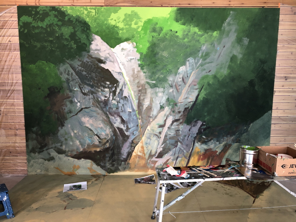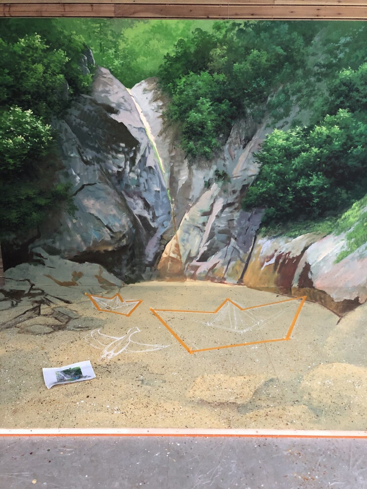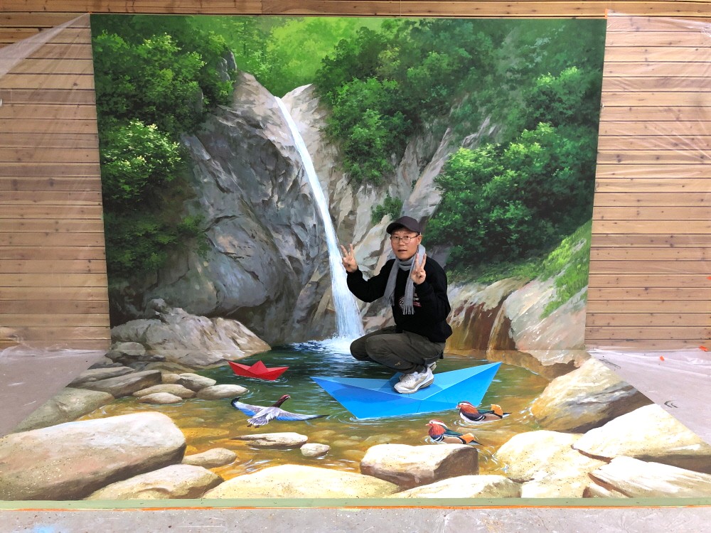 비룡폭포를 배경으로 한 트릭아트 포토존입니다.폭포에서 떨어지는 물과 계곡이 바닥까지 자연스럽게 이어져 실제 공간처럼 보이는 착시 효과를 줍니다.종이배 위에 올라선 듯한 연출과 물속을 헤엄치는 새 그림이 어우러져, 방문객이 장면 속 주인공이 되는 체험형 포토존입니다.