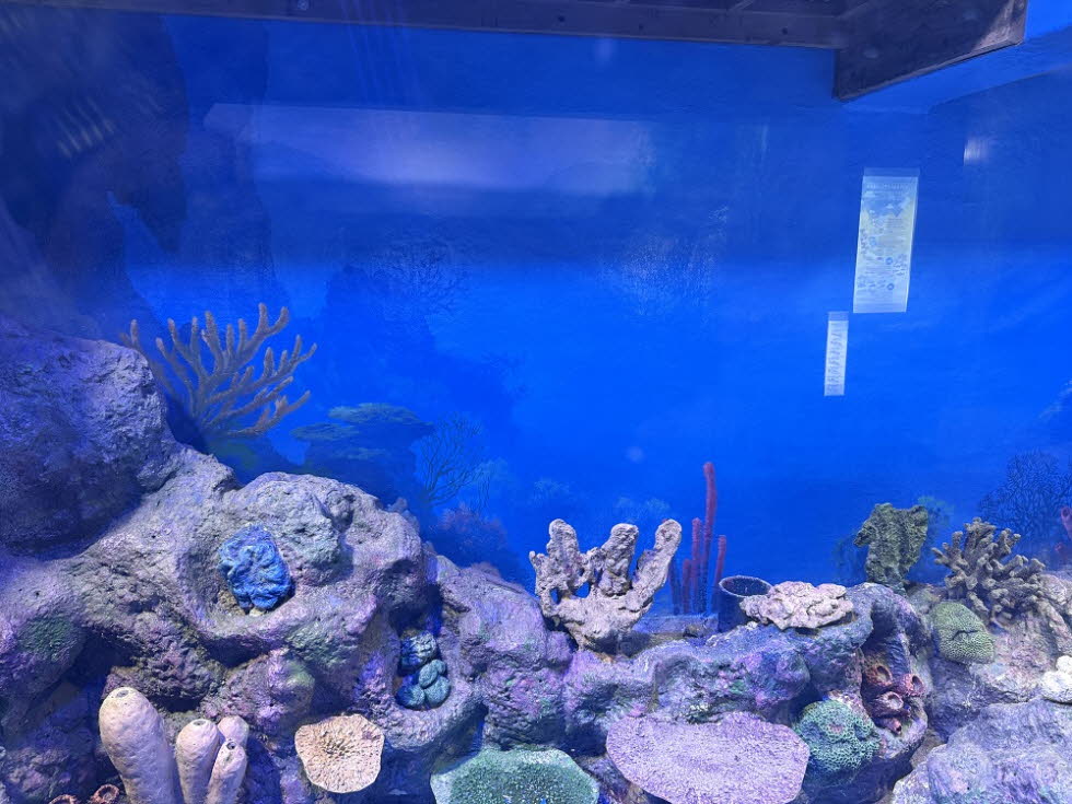 수족관 내부에 조형물과 배경이 하나로 어우러지게
