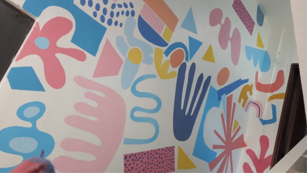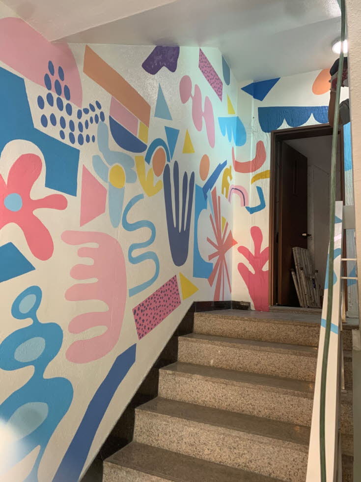 패턴 형식의 모던한 그래픽 아트 페인팅으로 계단벽면을 화사하고