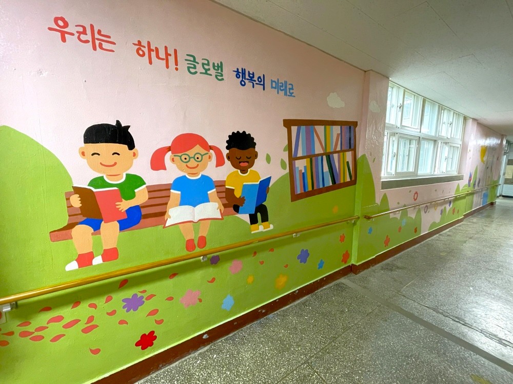 경기도 내 학교 담장과 계단에 교내 학생들과 선생님들이“내손으로 학교 꾸미기” 벽화 프로젝트에 함께 참여하여명랑한 색채로 자연의 풍요로움을 그래픽 벽화로 제작
