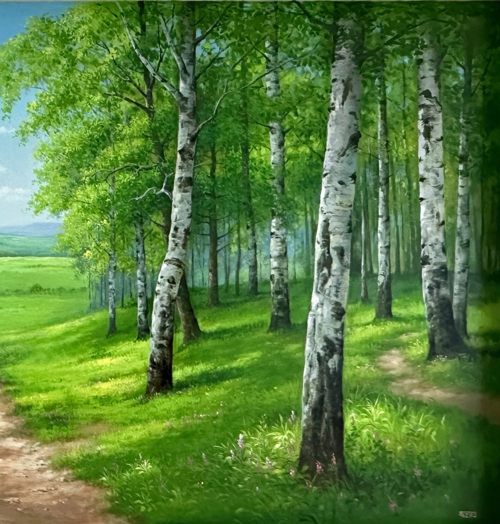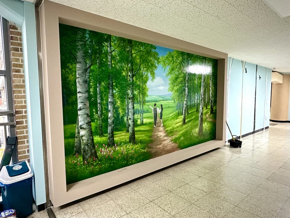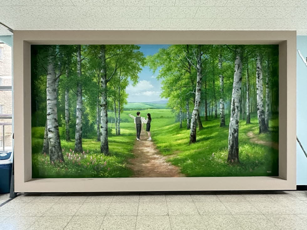 학교 도서관 벽면에 자작나무숲을 사실적 표현으로 제작하여